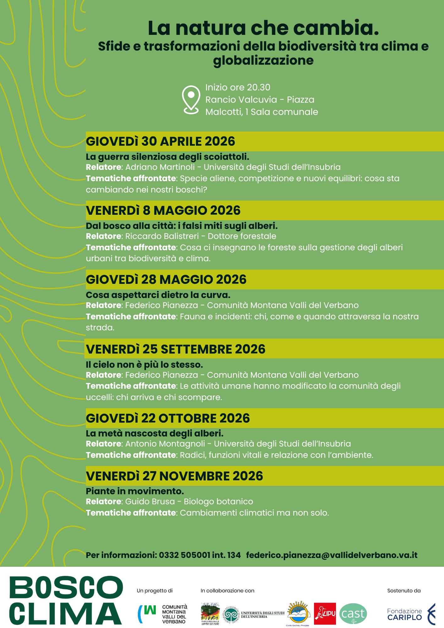 L’iniziativa nasce nell’ambito del progetto Bosco Clima, un percorso che coinvolge 25 Comuni del territorio e che mira a sviluppare una Strategia di Transizione Climatica innovativa. Il progetto è realizzato dalla Comunità Montana Valli del Verbano in collaborazione con il Parco Campo dei Fiori, l’Università degli Studi dell’Insubria, il Centro Geofisico Prealpino e le associazioni LIPU e CAST, con il sostegno di Fondazione Cariplo nell’ambito del programma F2C.