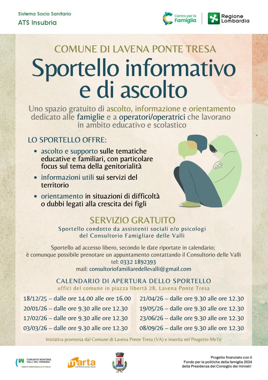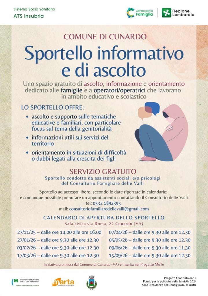 In particolare, oltre allo sportello informativo e orientativo gratuito già attivo presso il consultorio di Cadegliano Viconago, che è uno dei centri spoke di “Me-Te”, si aggiungono due sportelli che prevedono degli appuntamenti mensili presso i Comuni di Cunardo e Lavena Ponte Tresa.