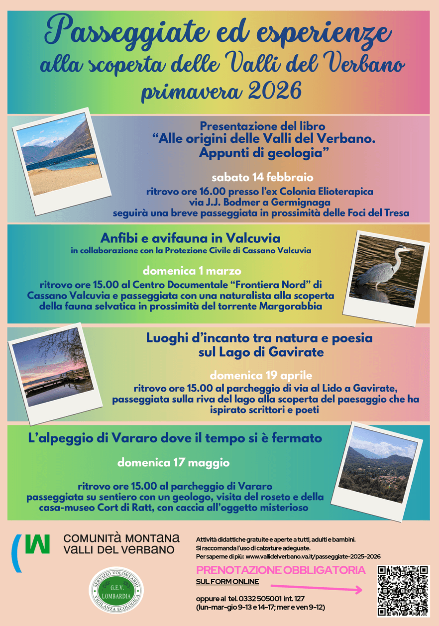 Anche le proposte per il nuovo anno, gratuite e aperte a tutti, prendono ispirazione dai progetti inseriti nel catalogo dell’offerta didattica “Tra il verde e l’azzurro. A scuola di ambiente e territorio nelle Valli del Verbano”, che raccoglie percorsi educativi pensati per avvicinare il pubblico alla storia, alla natura e alle tradizioni dell’Alto Verbano.